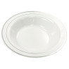 Descripción: Plato Hondo desechable de color Blanco con Ribete Plateado fabricado en Plástico Rígido (PS).